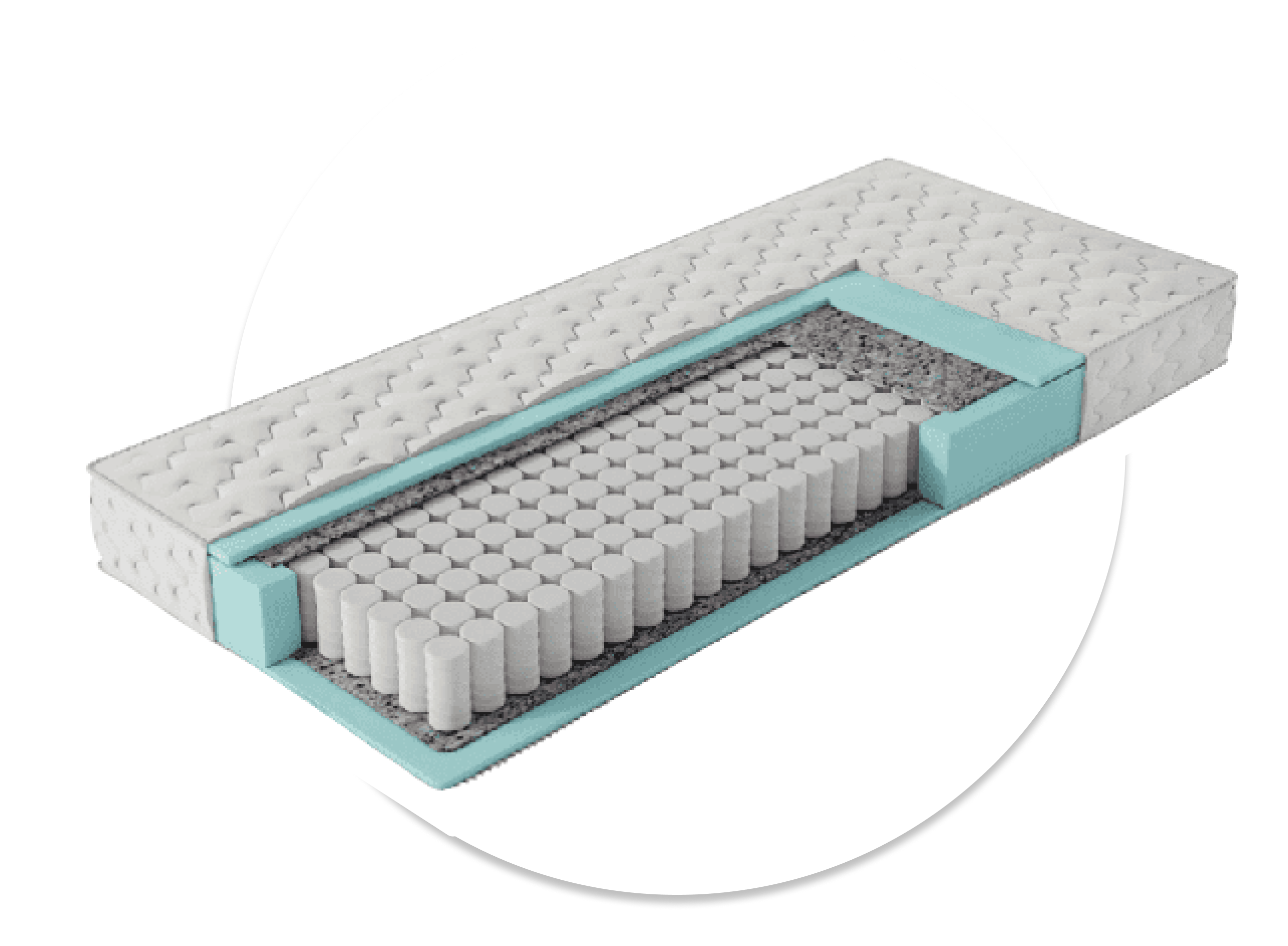 Блок независимых пружин TFK (256 пр./м2), подстраивающийся под контуры тела ребенка во время сна. Вся поверхность матраса выполнена из хлопкового жаккарда белого цвета, простеганного на гипоаллергенном нетканом материале, специально для детей.