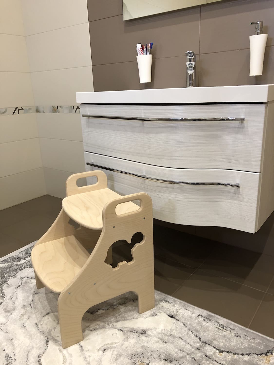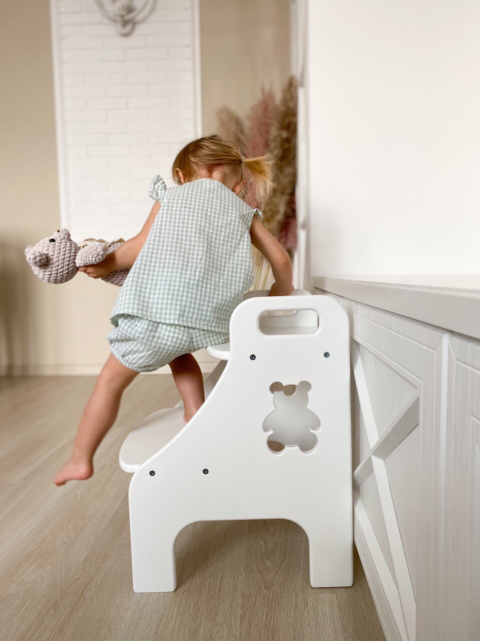 Универсальный помощник для малыша. Он сможет использовать её как лесенку, чтобы дотянуться до предмета, как стул и даже как столик, рисуя на верхнем сиденьи. Ступенька может быть изготовлена из МДФ (мишка и утка) или фанеры (черепаха).